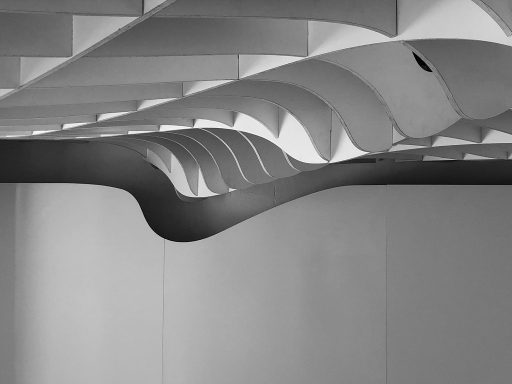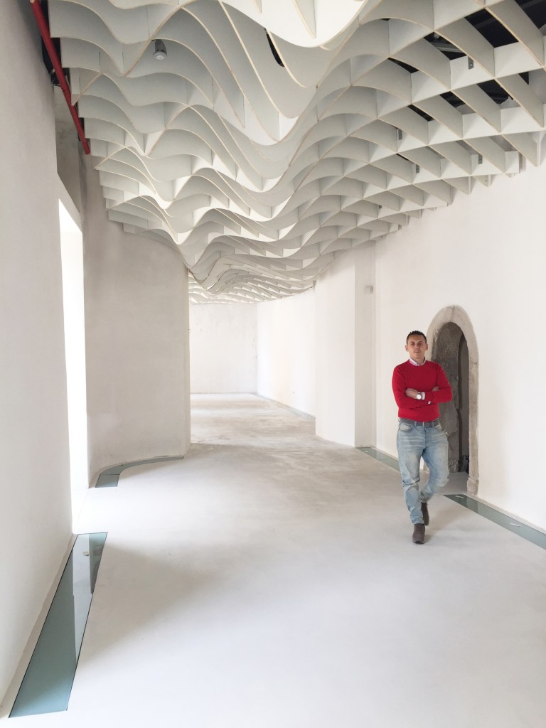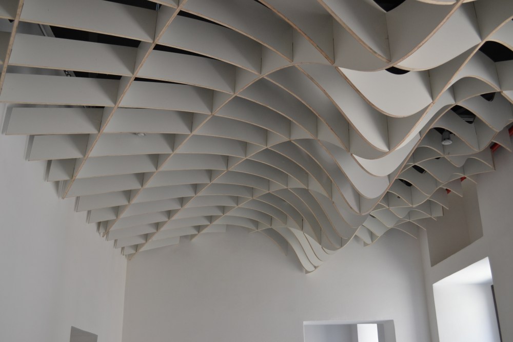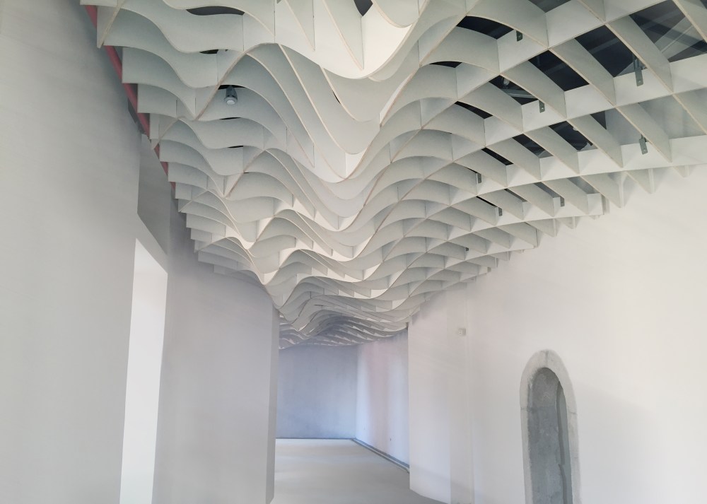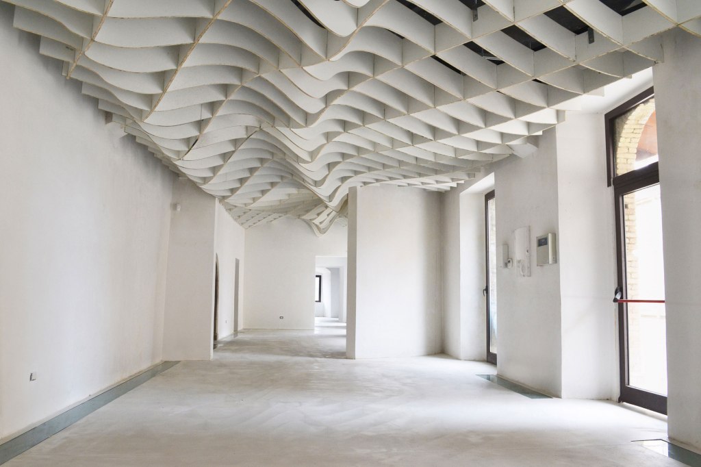 L’entrata, organica e moderna, è caratterizzata dalla monumentale controsoffittatura a costoloni lignei che riproduce un’onda sismica tagliata e sezionata in vari punti e poi assemblati ad incastro ed appesi. Una realizzazione questa che è stata possibile grazie all’innovazione tecnologica in ambito architettonico: il tutto è stato progettato parametricamente e poi i singoli pezzi sono stati tagliati con macchine a controllo numerico.