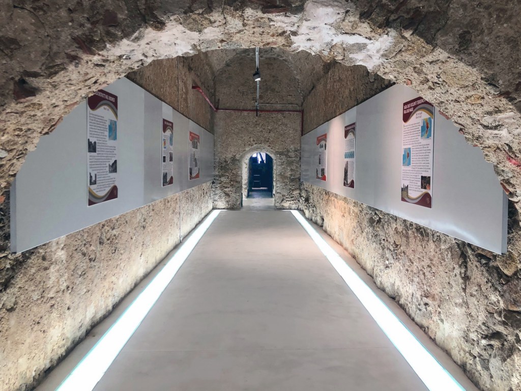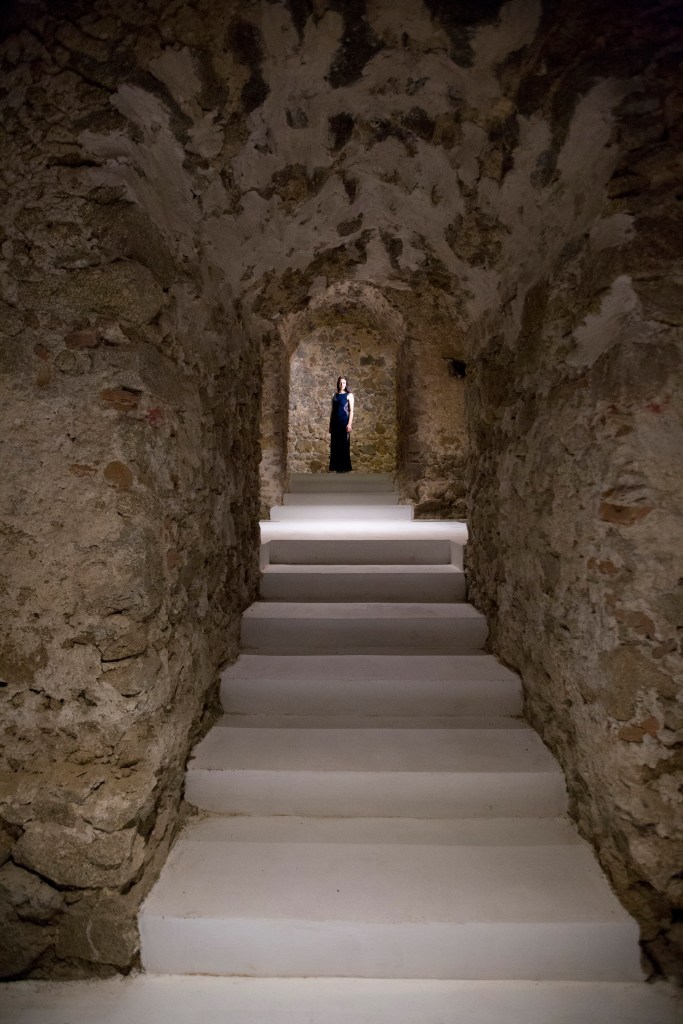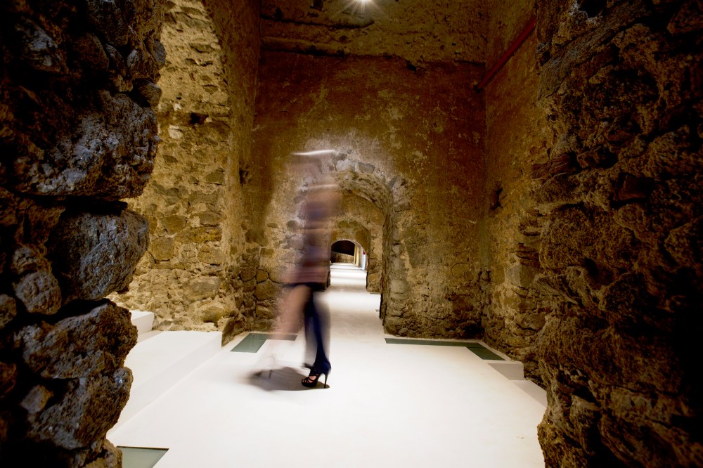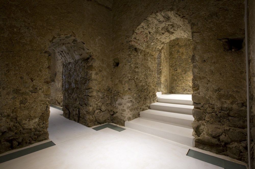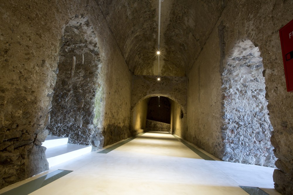 Da questo spazio luminoso e inaspettato il visitatore è condotto negli “Scuri”, la parte antica, testimonianza del terremoto del 1783. Un’atmosfera più suggestiva avvolge l’ambiente, l’intervento in questa parte è volto a valorizzare l’esistente, le volte a botte infatti risaltano grazie alla pavimentazione in resina di colore bianco.
